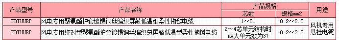 额定电压300/500V及以下风电专用低温型柔性拖链电缆产品型号、规格及主要参数使用特性:电缆移动敷设时,使用温度范围为:-40℃~+90℃;电缆固定敷设时,使用温度范围为-50℃~+90℃。固定敷设