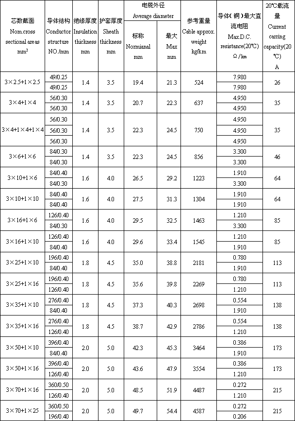 | 产品标准standard 本产品按GB12972-1991《矿用橡套软电缆》、MT818-1999《煤矿用阻燃电缆》及Q/320282DCE037-2003标准生产,同时还可根据用户需要按******电工委员会推荐标准IEC、英国标准、德国标准及美国标准生产。 The product is manufactured according to the standard 《Flexible rubber-sheathed cables for mining purposes》of GB12972-1991,《Flame retardant drade flexible rubber-sheathed cables for mining purposes》of MT818-1999, and Q/320282DCE037-2003, and the same time is also manufactured according to the standard of IEC、English、Germany and America. 适用范围Applications 矿用橡套软电缆适用于工频额定电压U0/U660/1140V及以下矿用动力装置用移动敷设的电缆。 Flexible rubber-sheathed cables for mining purposes of suitable for mining purposes power device with moving installation and rated voltage up to and including 660/1140V. 使用特性Operating characteristics ● 工频额定电压U0/U为380/660V、660/1140V。 Rated power-frequency voltage U0/U:380/660V and 660/1140V。 ● 电缆导体的高允许工作温度:65℃ Max. admissible operating temperature of the conductor:65℃ ● 电缆允许低的工作环境温度为-35℃ Permissible long-term operating temperature: Lowest working temperature is :-35℃ ● 电缆弯曲半径:The bending radius of cable D≤25mm.: ≥4D D>25mm.: ≥6D (D—Diameter of the cable). |